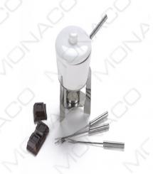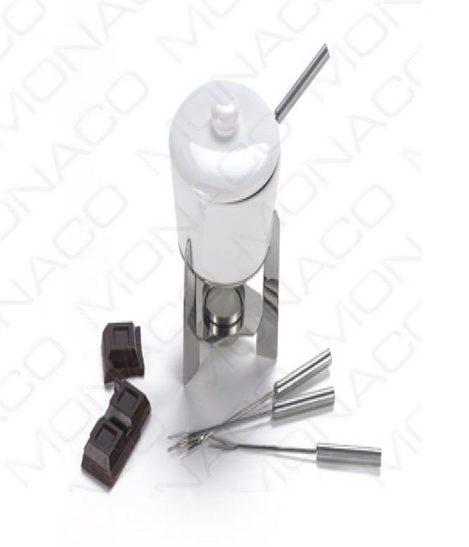 Set na čokoládové fondue. Sada obsahuje porcelánovou misku s pokličkou, nerezový stojánek na svíčku a 4 nerezové vidličky a odlišené počtem proužků na konci úchytu.