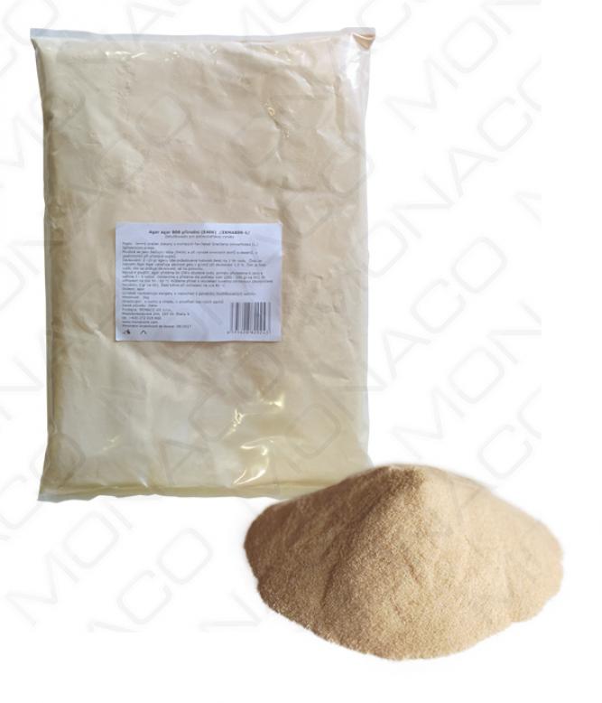 Agar je polysacharid složený převážně z cukerných jednotek D - galaktosy. Získává se extrakcí přirozených kmenů mořských řas čeledí Gracilaria converfoides (L.) Sphaerococcaceae. Agar je látka bez pachu nebo se slabým charakteristickým pachem. Práškový agar je barvy bílé, žlutavě bílé až světle žluté. Agar je nerozpustný ve studené vodě, ale rozpustný ve vroucí vodě. Číslo za názvem Agar Agar označuje pevnost gelu v g/cm2 při dávkování 1,5 %. Čím je číslo vyšší, tím se snižuje dávkování, až na polovinu.