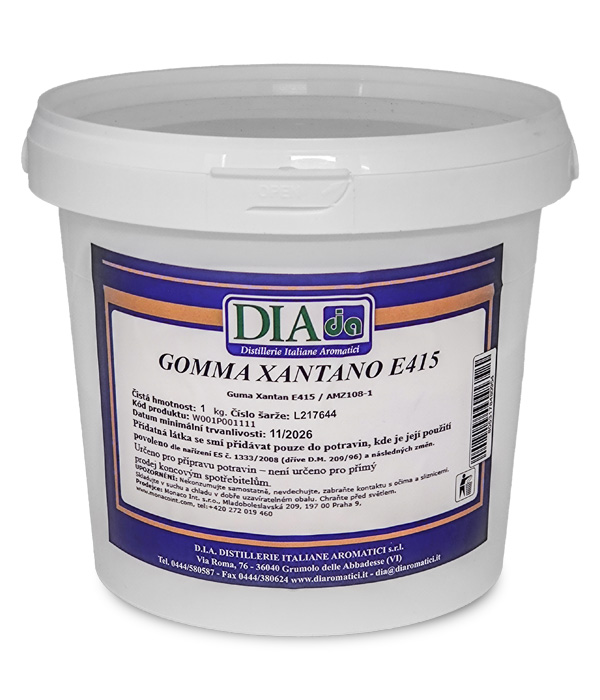 Xanthanová guma (prášek bez chuti a zápachu - polysacharid získaný fermentací cukrů bakteriemi Xanthomonas campestris).