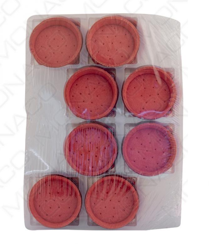 Košíčky jahodově červené z těsta s máslem sladké chuti k plnění jednohubek, předkrmů na cateringové bankety.
