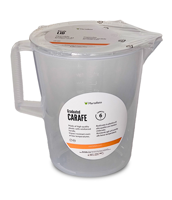 Profesionální plastová karafa MAXI, s objemem 6000ml. Průhledná s odjímatelným uzávěrem, stupnicí a zesíleným úchytem.