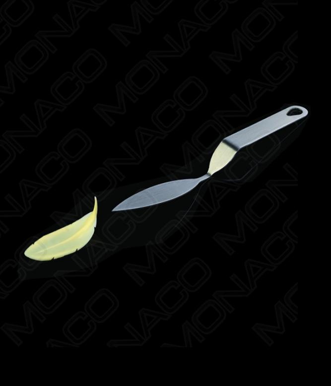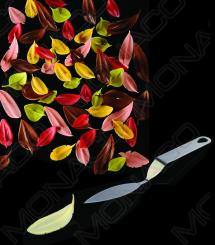 Nerezový nástroj na výrobu čokoládových dekorací ve tvaru peříčka velikosti M. Tyto nástroje jsou vyráběné ve spolupráci s cukrářskými mistry Stefano Laghi a Filippo Re, kteří jsou uznávanými autoritami v oboru.