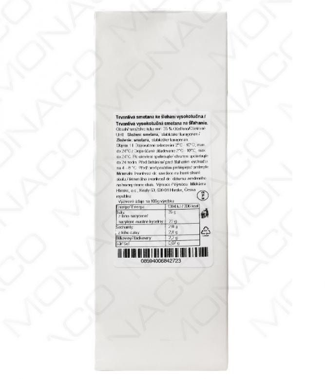 Smetana 35% UHT s trvanlivostí 5 měsíců, balena moderní technologií v aseptickém prostředí do obalu tetra pak, bez konzervačních přípravků.