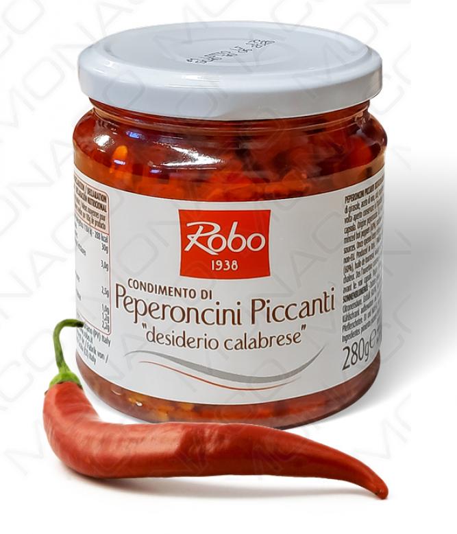 Pepperoncini Piccanti “DESIDERIO CALABRESE” - sekaná kalábrijská chilli paprička (feferonka) naložená ve slunečnicovém oleji je pikantní koření, pochutina. Tepelně upravena.