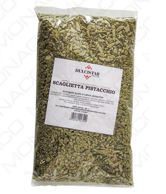 Pistáciové šupiny vyrobeny z polevy pistáciové chuti a zelenopistáciové barvy s dobrou přilnavostí ke zdobení cukrářských dortů a dezertů. K použití na zdobení cukrářských variací dubajské čokolády.