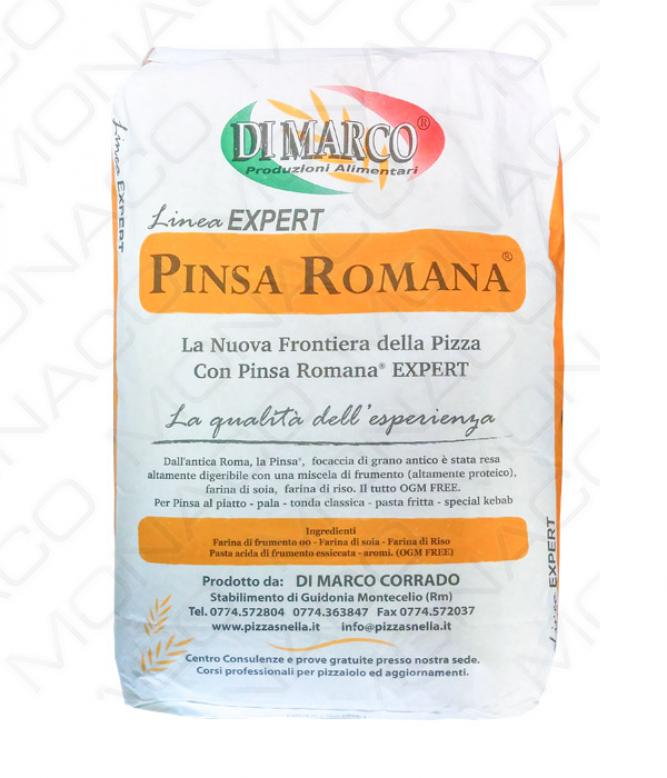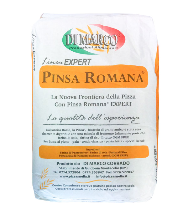 Speciální mouka pro římský typ pizzy „Pinsa Romana“. Pinsa Romana se vyznačuje křupavým povrchem, vláčností uvnitř a lehkou stravitelností. Toho dosáhneme pokud těsto absorbuje co největší množství vody, proto je vysoce kvalitní pšeničná mouka obohacena o mouku rýžovou a sojovou. Každá z těchto surovin má určitou schopnost: vybraná italská pšeničná mouka s vysokým obsahem bílkovin, váže až 80% vody a umožňuje těstu kynout až 48 hodin, což činí těsto lehce stravitelné. Rýžová mouka zadržuje vodu i po propečení výrobku a zároveň napomáhá křehkosti a křupavosti povrchu. Dále mouka ze sóji obsahuje kvalitní rostlinné bílkoviny, které plně nahrazují vlastnosti sádla, přidávaného běžně do pizzy. Díky použití sojové mouky, je pak výrobek 100% rostlinného původu. Další složkou je kvalitní přírodní sušený kvásek, který zajišťuje stejnoměrné kynutí, standardní kvalitu a také šetří čas a náklady na výrobu. Tato optimalizovaná směs mouk je výsledkem dlouholetého vývoje a italské tradice, za vzniku famózní „Pinsy Romany“, která se neliší od klasické pizzy pouze tvarem, ale hlavně chutí, křehkostí a výrobním postupem. Výrobní postup Vás můžeme naučit u Vás v provozovně nebo u nás na kuzech "Pinsa Romana".