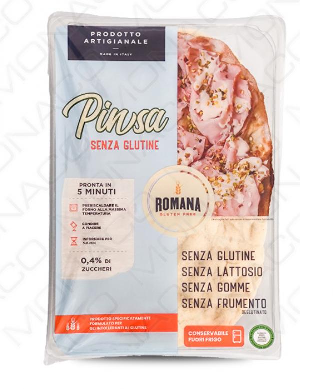 Bezlepkový předpečený polovar římského typu pizzy „Pinsa Romana“ k následnému ochucení dle Vašeho výběru baleno pod ochrannou atmosférou. Pinsa Romana se vyznačuje křupavým povrchem, vláčností uvnitř a lehkou stravitelností.