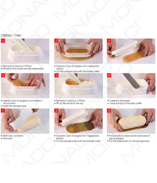 Profesionální silikonová forma ideální pro přípravu romantických dezertů ve tvaru válce. MRPILLOW lze použít k přípravě sladkých i slaných dezertů. Tuto formu je možné použít v kombinaci s formou JRPILLOW, která tvoří její vložku. Je odolná teplotě od -60°C do +230°C. Každé balení obsahuje plastové vykrajovátko, které poslouží k výrobě originálních vložek a/nebo základen, které bezvadně pasují s tvarem formy. Forma se dá použít v mikrovlnné troubě, snadnou údržbu zaručuje možnost mýt ji ručně nebo v myčce. Před použitím výrobek opláchněte ve vodě.