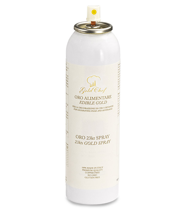 Jedlé zlato (23 karátů) ve spreji – bez mědi (E175). Obsahuje 200 mg páškového zlata. K dekoraci slavnostních čokoládových a cukrářských výrobků, nebo pokrmů přímo na místě v gastronomii.