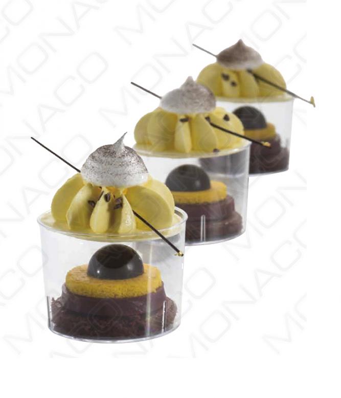 Lehký a nerozbitný pohárek s elegantním, minimalistickým vzhledem, vhodný na dezerty. Je funkční alternativou skla a výborně se hodí k servírování dezertů a jednohubek, ideální pro různé příležitosti. Vyrobeny v Itálii z vysoce kvalitního materiálu, jsou odolné, lesklé a průhledné. 100% recyklovatelné a bez BPA. Teplotní tolerance: -18 °C až +70 °C. Jsou také opakovaně použitelné a vhodné do myčky nádobí až 50krát.