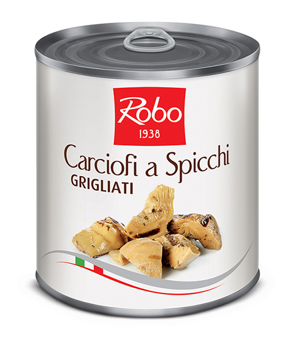 Artyčoky Carciofi - vybrané, zralé a umyté artyčoky, očištěné od nejedlých částí, nakrájené na čtvrtky a grilované. Následně naložené ve slunečnicovém oleji a balené do plechovek.