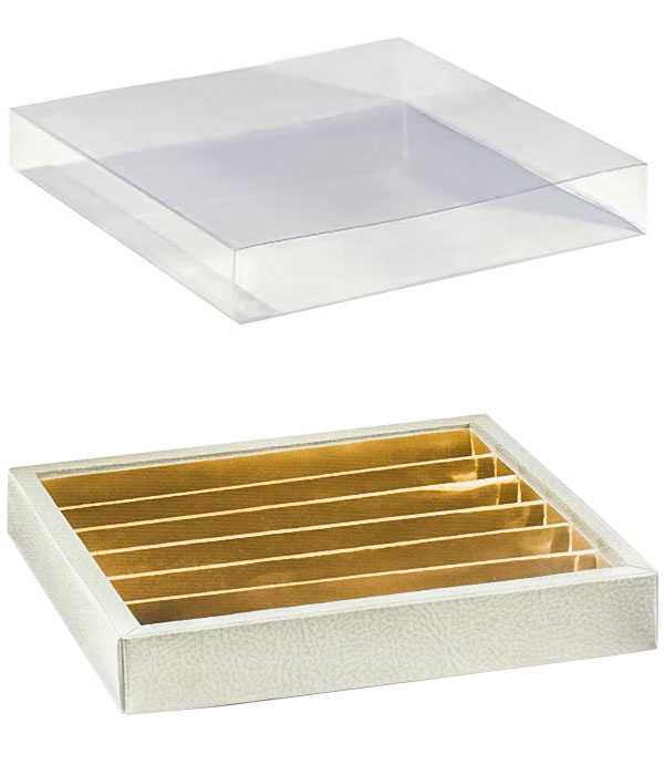 Velice elegantní papírová krabička na pralinky v bílé barvě s jemným reliéfním vzorem kůže s čirým plastovým obalem.