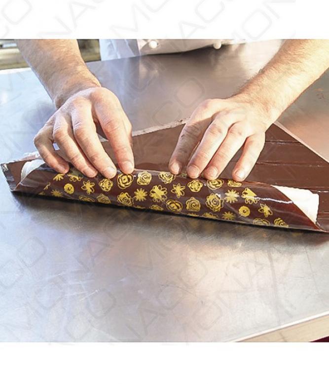 Fólie na dekoraci čokolády k použití zejména na pralinky, obtisky na dorty s čokoládovou polevou a ostatní čokoládové výrobky. Lze pomocí kakaového másla, které naleznete na nešwm webu - kód LESBUT1 přenést vzor transferové folie také jinam než na čokoládu, například na modelovací a potahovací hmoty, potřete je rozpuštěným kakaovým máslem, které se spojí s kakaovým máslem obsaženým v potisku na folii a tím dojde k přenesení motivu na požadovaný povrch. Necháte chvíli zchladnout a ztuhnout, poté opatrně sejmete folii.