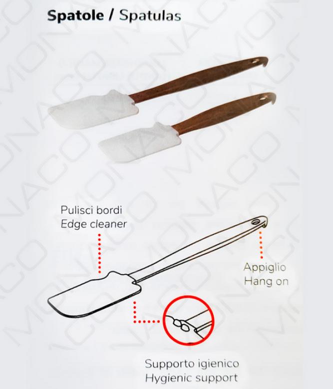 Gastro náčiní vyrobeno z platinového silikonu odolného do 250 °C. Má speciální zářez pro čištění okrajů nádob, a speciální výčnělky pro bezkontaktní opření na plochu. Extra rukojeť, odolná až do 220 ° a k zavěšení pro pohodlnou oporu při zpracování.