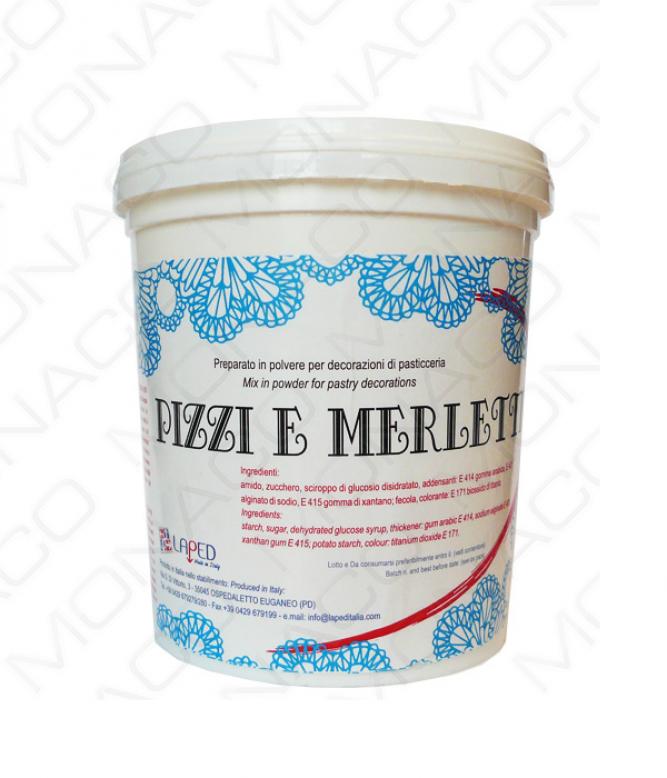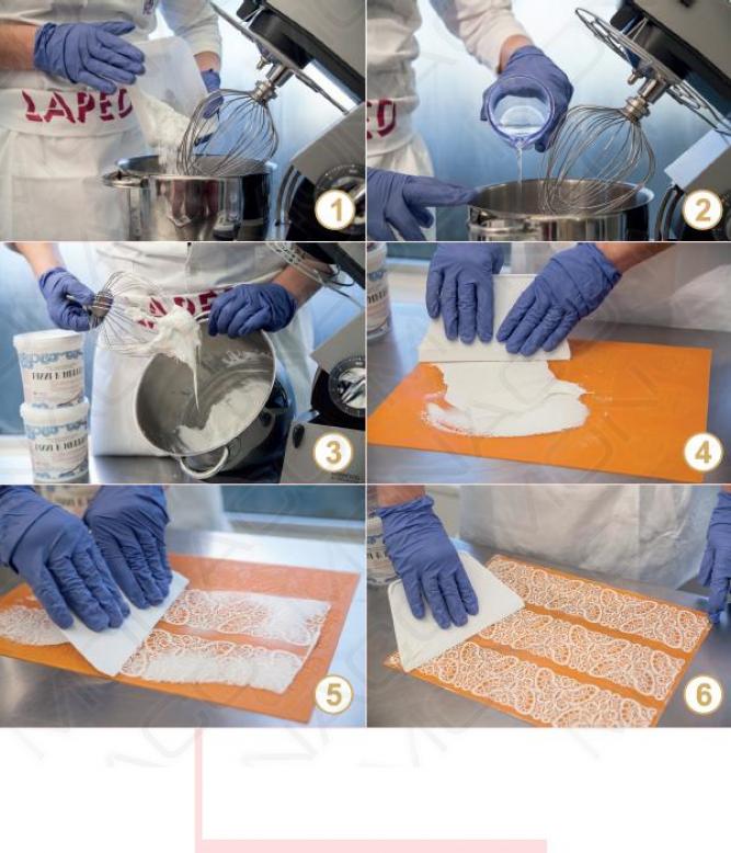 Do šlehače vysypte předem odměřené množství prášku a přidejte 85 g vlažné vody na 100 g směsi Pizzi e Merletti. Míchejte na střední otáčky cca 2 minuty. Pomocí stěrky nebo karty rozetřete hmotu na silikonovou šablonu - nejprve napříč a poté podélně - a ujistěte se, že je hmota rovnoměrně rozetřena po celém vzoru. Nechte usušit při pokojové teplotě cca 4–6 hodin nebo 14 minut v troubě