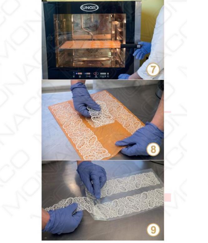 při 90 °C (po vyjmutí z trouby nechat odpočinout při pokojové teplotě cca 5–10 minut). Hmota perfektně drží tvar podle vzoru na šabloně a neztrácí svůj objem.