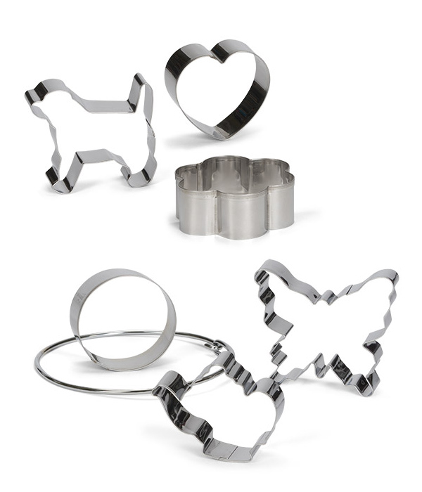 Nerezová vykrajovátka s kruhem na cukrářské a pekařské výrobky. Mají tvar motýla, psa, kruhu, květu, srdce a čajové konvice.