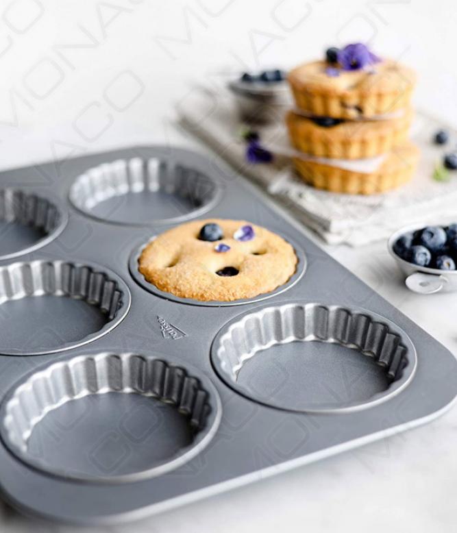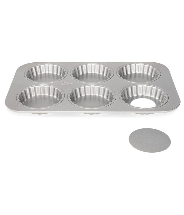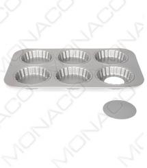 Forma na 6 ks tartaletek s odjímatelným dnem ze série Silver-Top vyrobena z chromované oceli ECCS. Materiál tohoto výrobku je odolný do 230°C, nepřilnavý povrch má tloušťku 8-10 mikron a má větší odolnost vůči skvrnám a poškrábání.