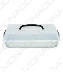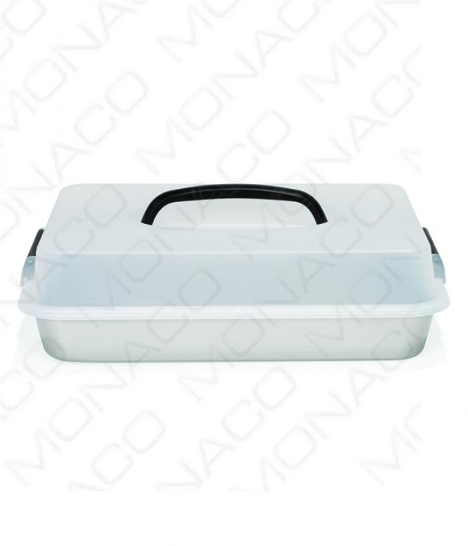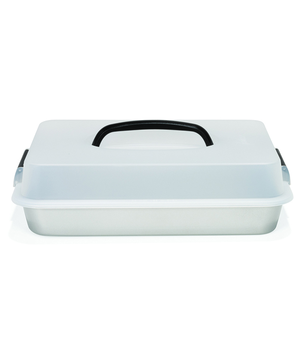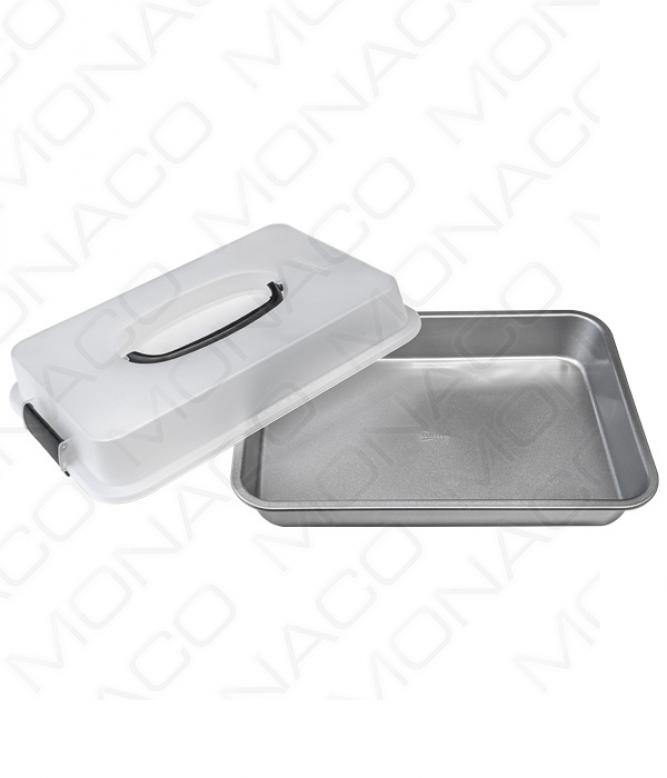 Pekáč s nepřilnavým povrchem a přepravním, plastovým víkem.