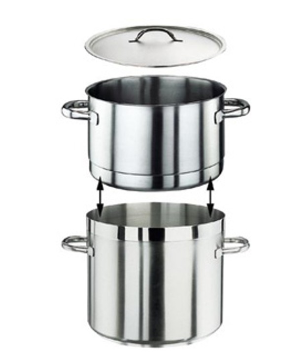 Parní sestava ( hrnec, horní nástavec a poklička ) pro profesionální použítí ze satinované oceli se zesíleným okrajem.