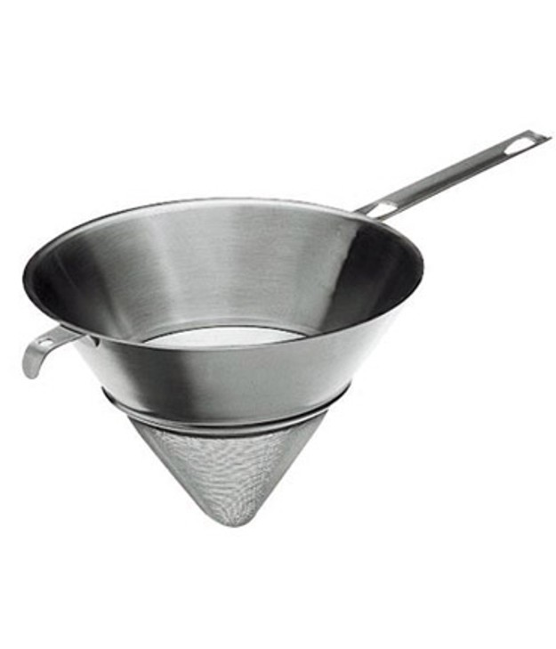 Cedník z nerezové oceli s jemným drátěným sítem.