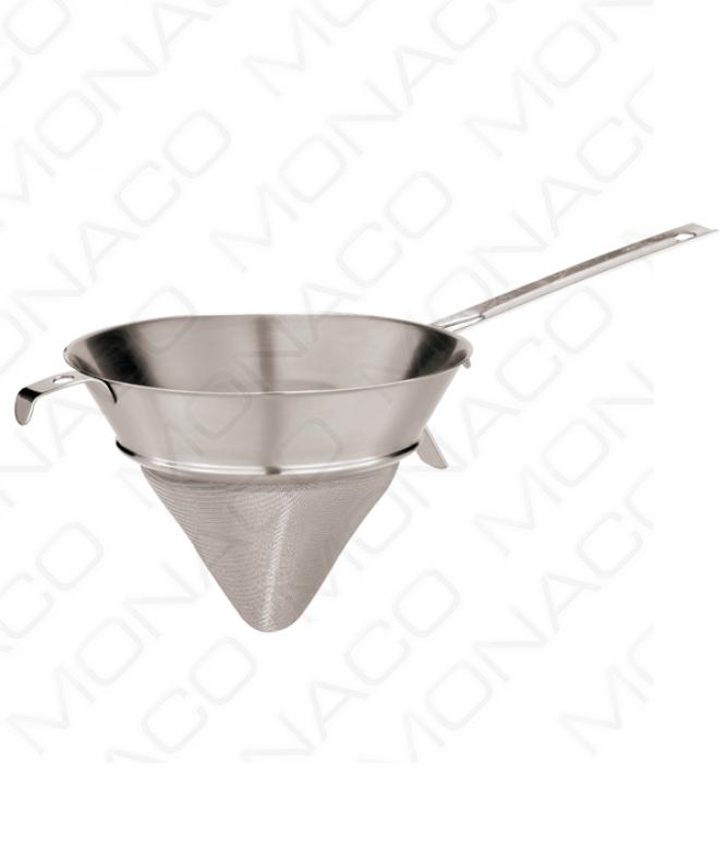 Cedník z nerezové oceli s jemným drátěným sítem.