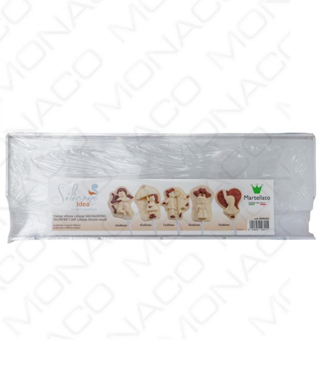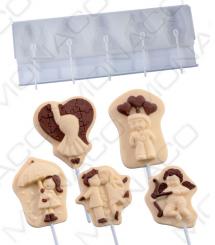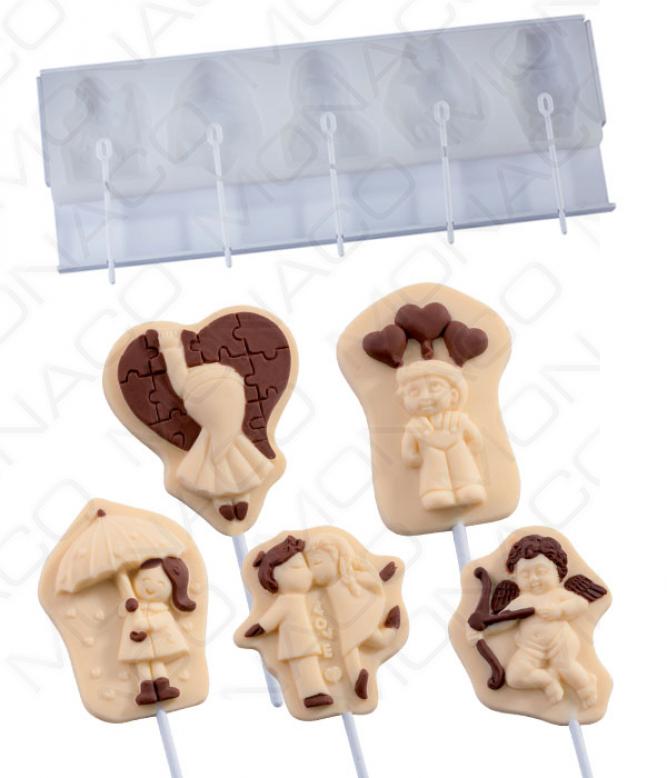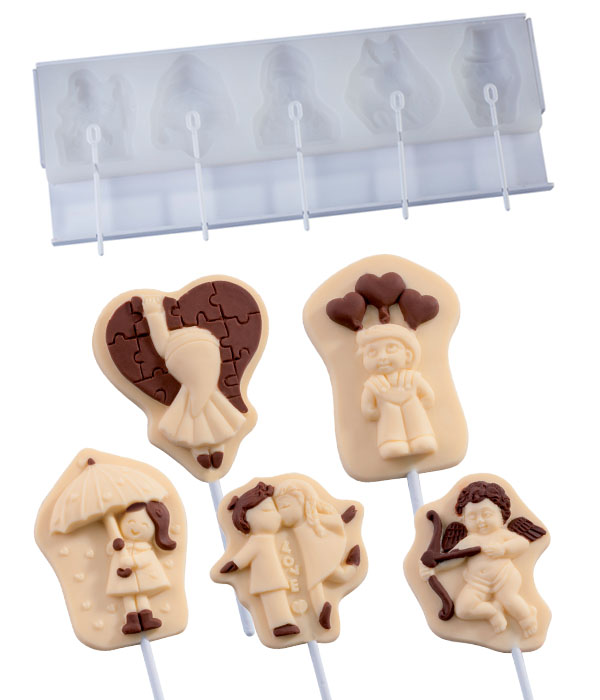 Silikonová forma s pevným polykarbonátovým držákem na výrobu čokoládových lízátek s motivy zamilovaných.