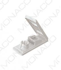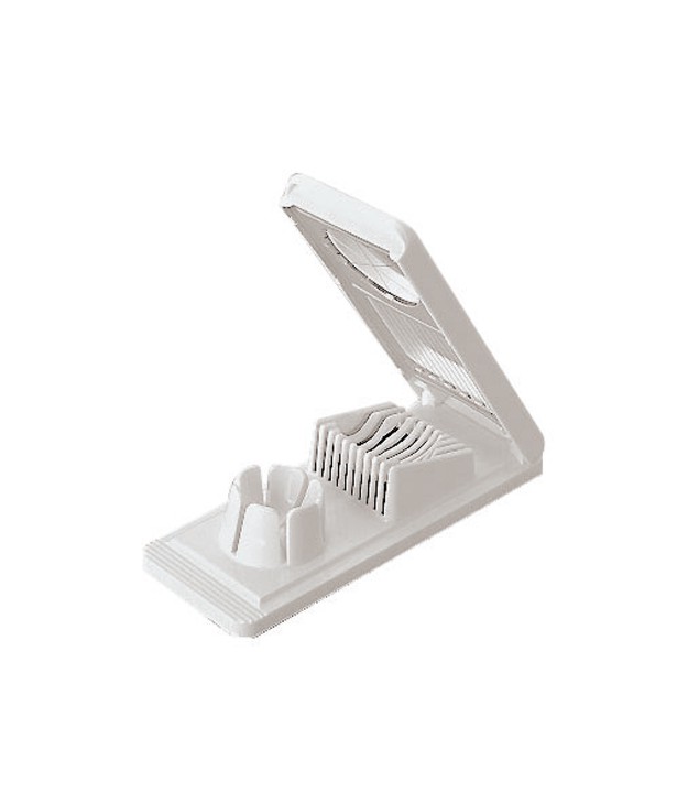 Polykrabonátový kraječ vajec ze dvou částí – buď na plátky 0,5 plátky nebo nebo půlměsíce 1/6Kovové struny, vyrobeno v Itálií