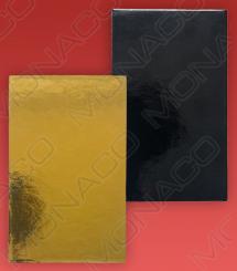 Papírová dortová podložka s hladkým okrajem, obdélníková, velmi pevná. Potažená oboustranně zlatou/černou folií odolnou proti vlhku. Ideální jako nosič zákusků.