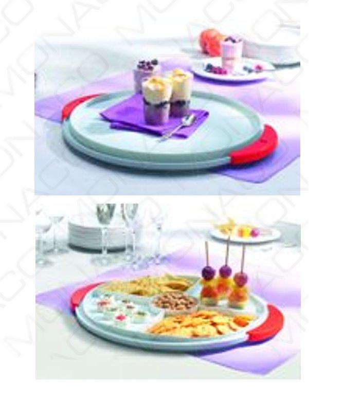 Box se skládá z podnosu, který může sloužit jako tác na jednohubky (rozdělen na 5 přihrádek), tak i jako servírovací
