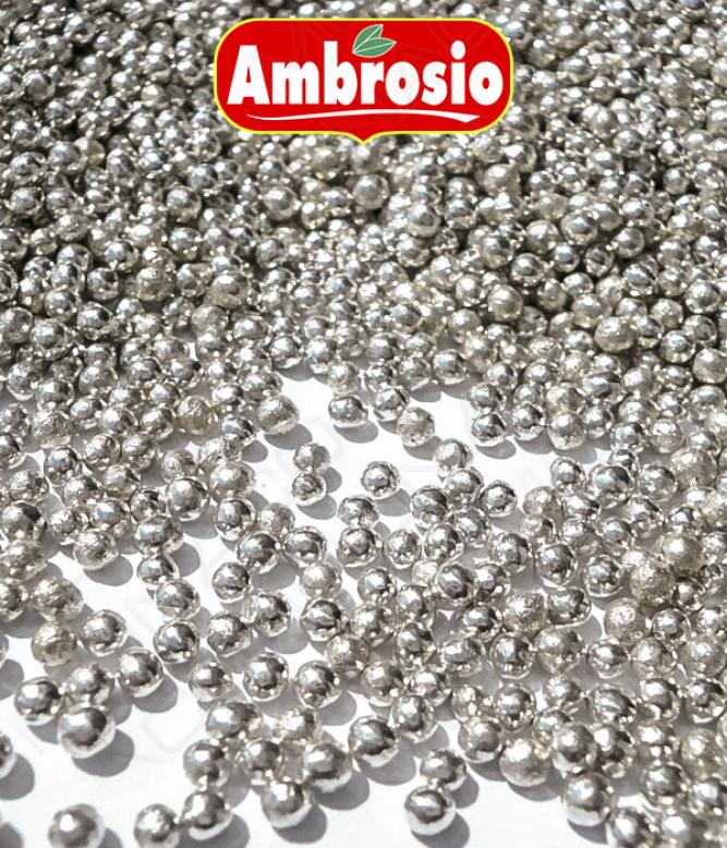 Cukrové kuličky potahované stříbrnou barvou se používají v cukrářské výrobě na zdobení dortů,