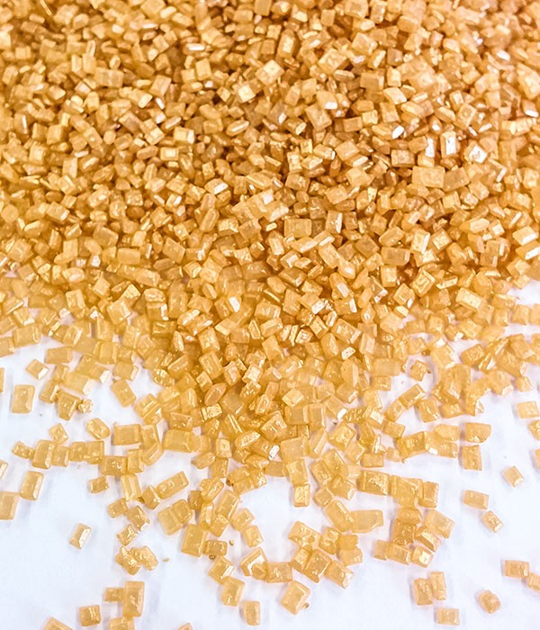 Zlaté cukrové krystalky k dekoraci cukrářských výrobků a čokoládových pralinek.