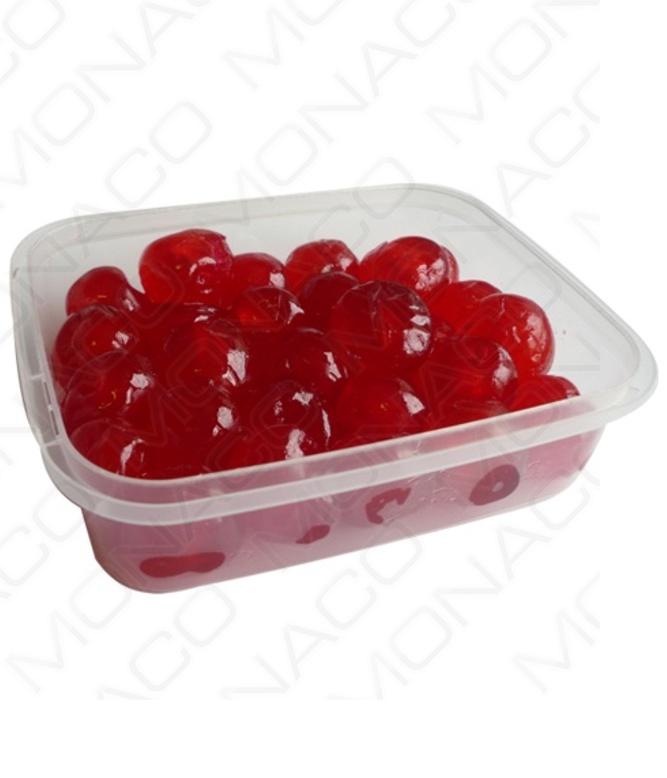 Kandované červené třešně jsou kalibrované, odstopkované a vypeckované třešně vyrobené procesem pomalého kandování.