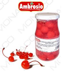 Kalibrované a vypeckované třešně, upravené procesem pomalého kandování, za použití maraskového sirupu.