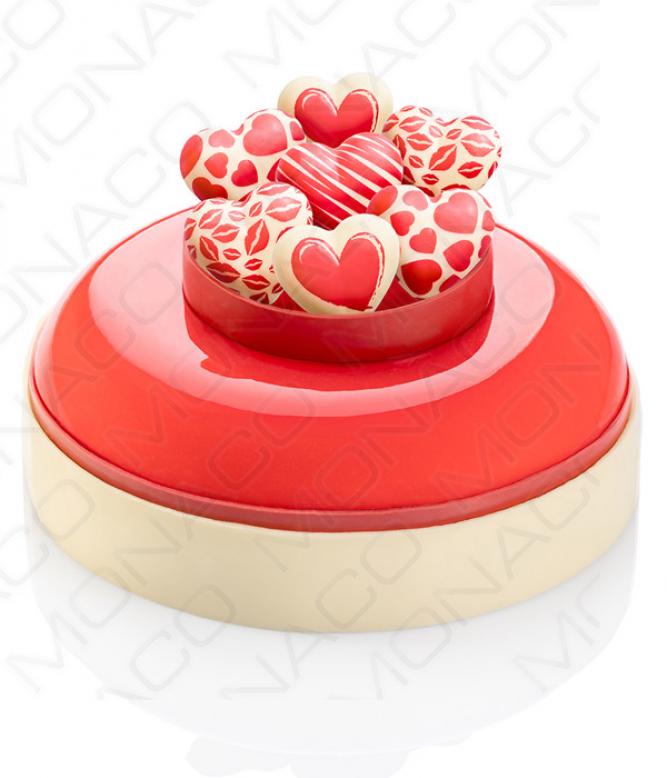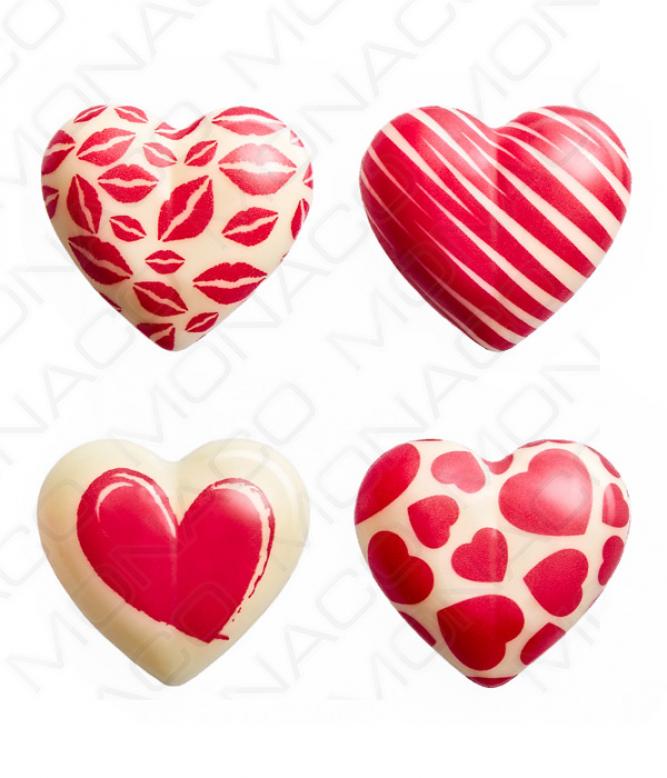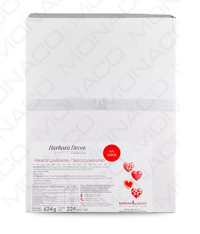 Čokoládové srdce Hearts Lovissimo 3x2,7cm, 4 červený dekory 224 ks/bal (624g)