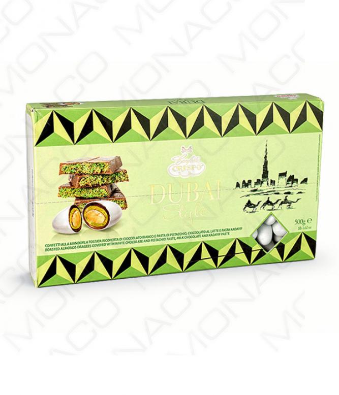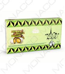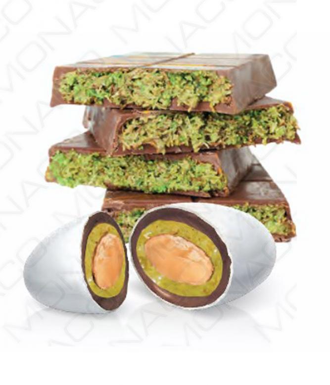 Popis: Dražé z pražených mandlí v bílé čokoládě s pistáciovou pastou, mléčnou čokoládou a kadayif pastou.