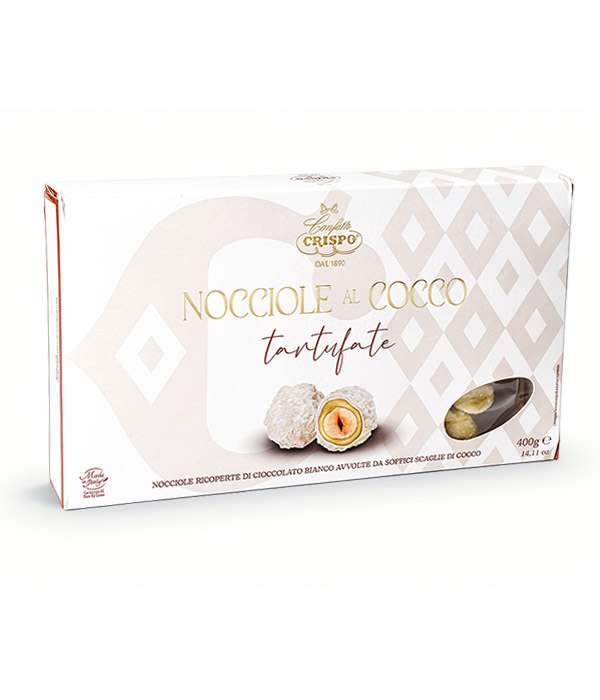 Čokoládové lanýžky z křupavých lískových ořechů zahalených v jemné bílé čokoládě a nasledně posypané čerstvým a svěžím kokosem.