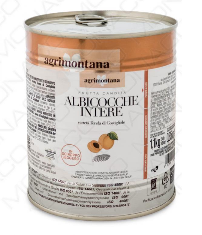 Celé meruňky včetně pecek kandované v jemném sirupu, pro dodání nezaměnitelné mandlové chuti. Odrůda Tonda di Costigliole. Pro svou delikátní chuť jsou vyhledávané zejména v cukrářské výrobě samostatně namáčené do hořké čokolády, na dekoraci a náplň dortů, dezertů a zmrzlin. Ovoce je ručně vybíráno. Do produktu nejsou přidávány žádné konzervanty, aromata ani barviva. Určeno pro profesionální použití.