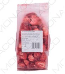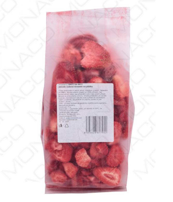 Plátky lyofilizovaných jahod (sušené mrazem) jsou 100% přírodní, bez konzervačních látek, bez přidaného cukru nebo jiných přísad. Bohatá na antioxidanty a živiny. Vhodné především při výrobě pralinek, čokoládových tabulek. Lze je přidat do cukrářských náplní a sušenek, také do jogurtu, pohárů atp.