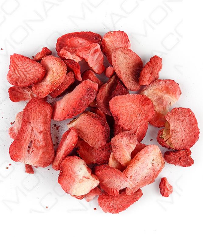 Plátky lyofilizovaných jahod (sušené mrazem) jsou 100% přírodní, bez konzervačních látek, bez přidaného cukru nebo jiných přísad. Bohatá na antioxidanty a živiny. Vhodné především při výrobě pralinek, čokoládových tabulek. Lze je přidat do cukrářských náplní a sušenek, také do jogurtu, pohárů atp.