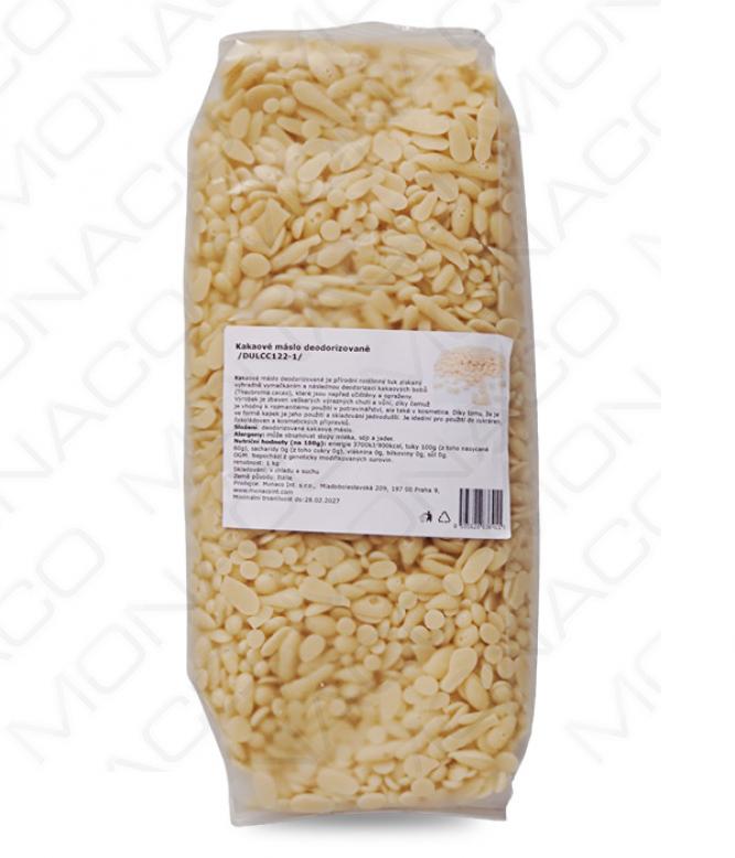 Kakaové máslo deodorizované je přírodní rostlinný tuk získaný výhradně vymačkáním a následnou deodorizací kakaových bobů (Theobroma cacao), které jsou napřed očištěny a opraženy. Výrobek je zbaven veškerých výrazných chutí a vůní, díky čemuž je vhodný k rozmanitému použití v potravinářství, ale také v kosmetice. Díky tomu, že je ve formě kapek je jeho použití a skladování jednodušší. Je ideální pro použití do cukráren, čokoládoven a kosmetických přípravků.