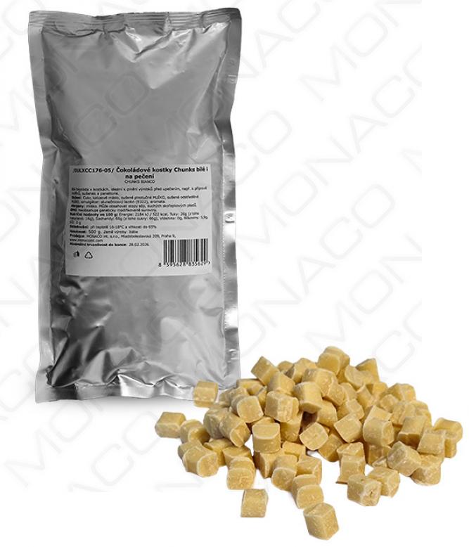Bílá čokoláda v kostkách, ideální k dekoraci a plnění výrobků před upečením, např. k přípravě muffinů, sušenek a panettone.