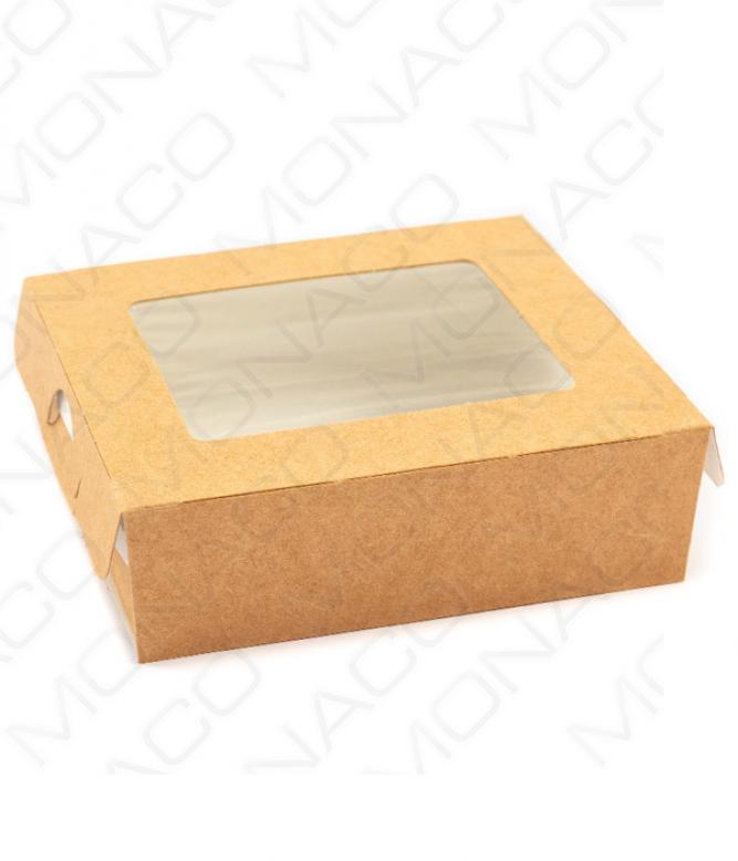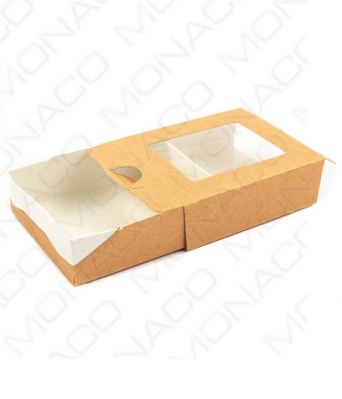 Vysouvací krabička na jídlo, která je voděodolná a nepromastitelná. Ideální pro bary, kavárny, restaurace a catering. Krabičky jsou vyrobené z kraftového papíru a jsou vhodné do trouby i do mikrovlnky. Krabička na jídlo je vyrobena z recyklovatelného materiálu, který ma za cíl snížít ekologickou zátěž obalů na pokrmy. Může být recyklovaná ihned po použítí. Průzor je z materiálu: PE a PP + PLA, není tedy recyklovatelný.