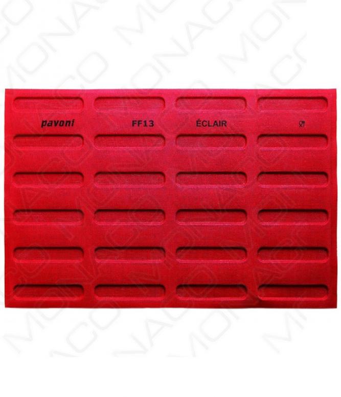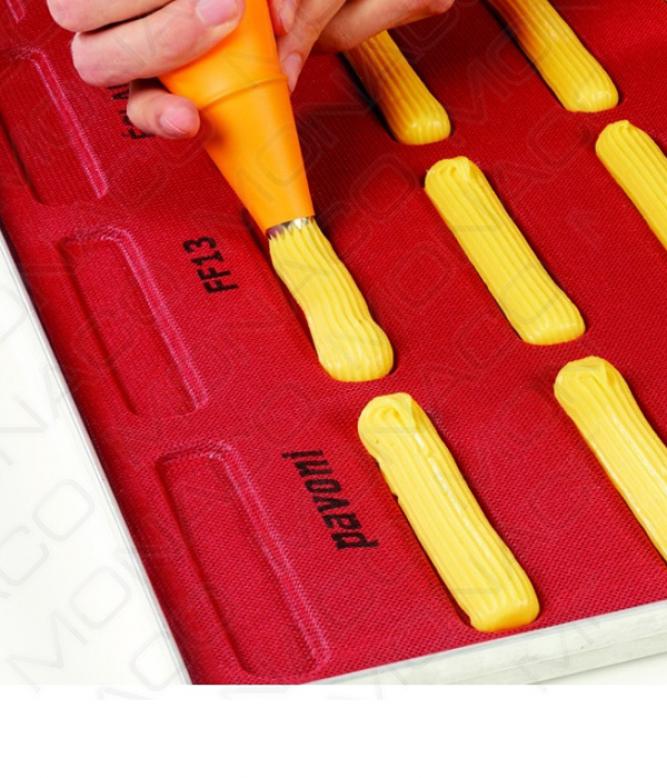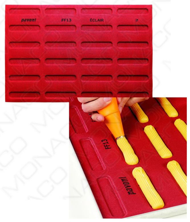 Silikonová, perforovaná nepřilnavá forma přímo navržená na výrobu eclairs.Může být používána v teplotním rozmezí od – 40° do + 280°C.Formu je možmé mýt ručně nebo v myčce. Snadná údržba. Zdravotně nezávadné.