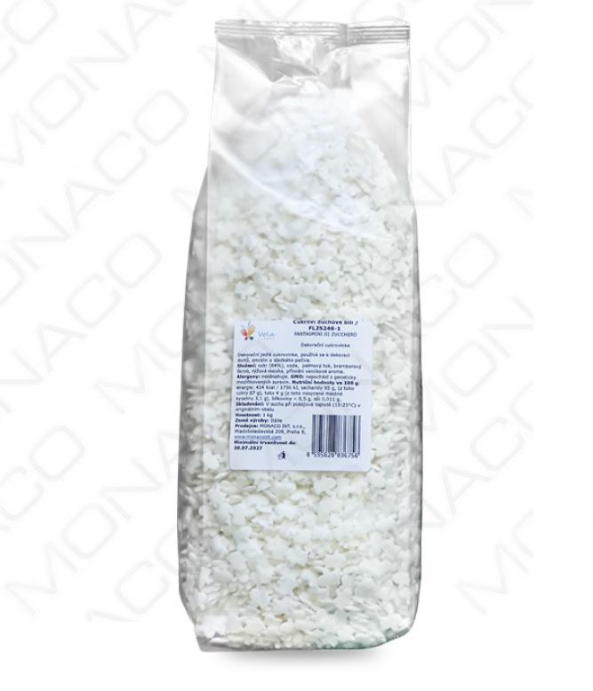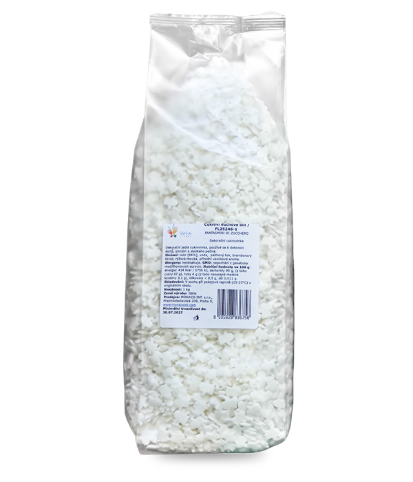 Cukroví duchové, používají se na dekoraci dortů a zmrzlinových pohárů.Složení: cukr (84%), voda, palmový tuk, bramborový škrob, rýžová mouka, přírodní vanilkové aroma.