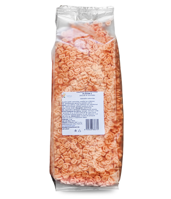 Cukrové dýně, používají se na dekoraci dortů a zmrzlinových pohárů.Složení: cukr (84%), voda, palmový tuk, bramborový škrob, rýžová mouka, přírodní vanilkové aroma, barviva: E120, E100.