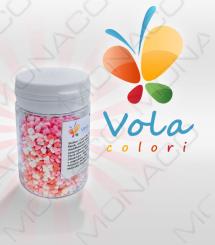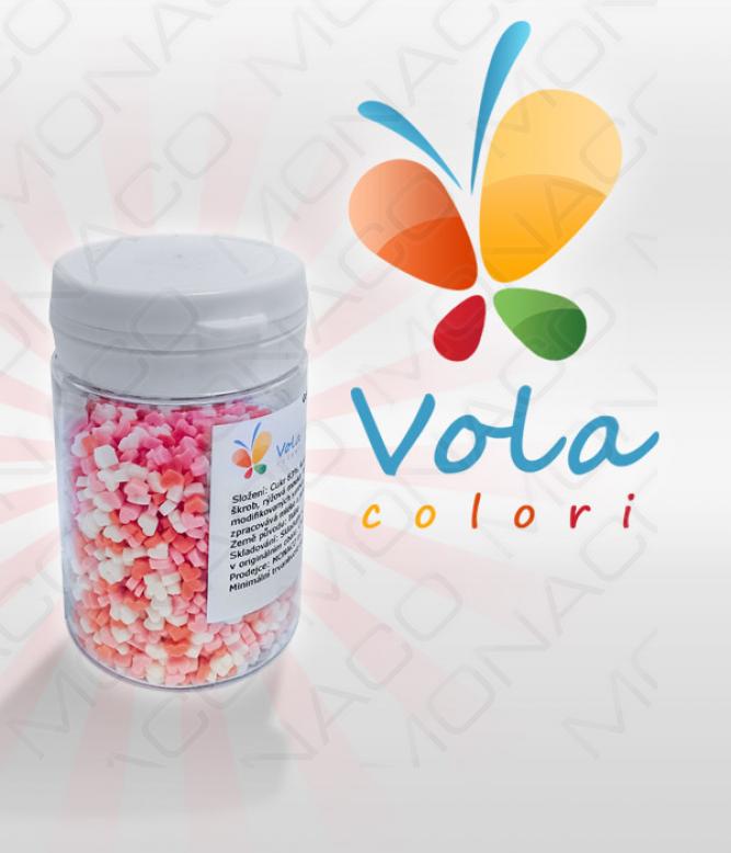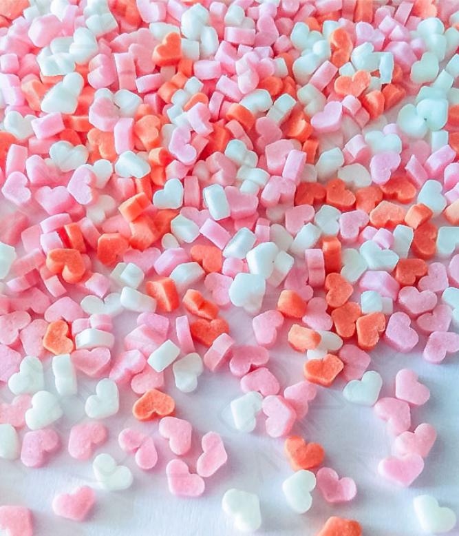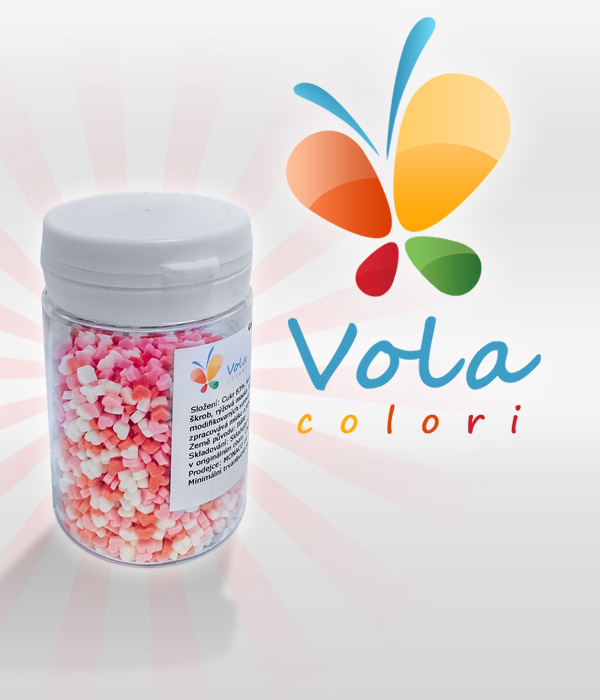 Cukrová barevná srdíčka. Používají se na dekoraci dortů a zmrzlinových pohárů.Složení: cukr 83%, palmový olej, voda, bramborový škrob, rýžová mouka, invertáza, aroma: vanilín, barviva: E120, E100.