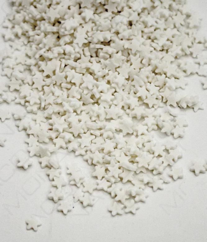 Cukrové hvězdičky bílé barvy. Jedlá dekorace vyrobená na cukrové a škrobové bázi vhodná k dekoraci dekoraci dortů a zmrzlinových pohárů.