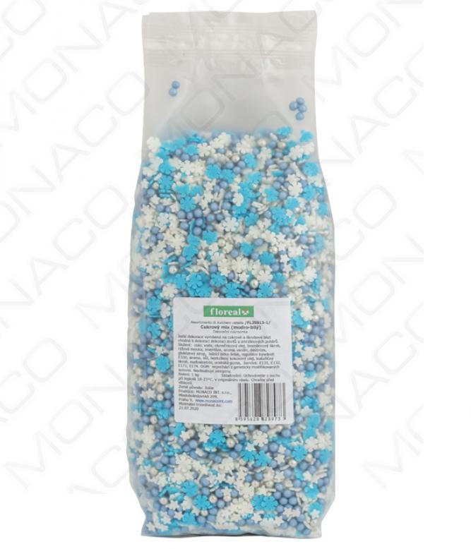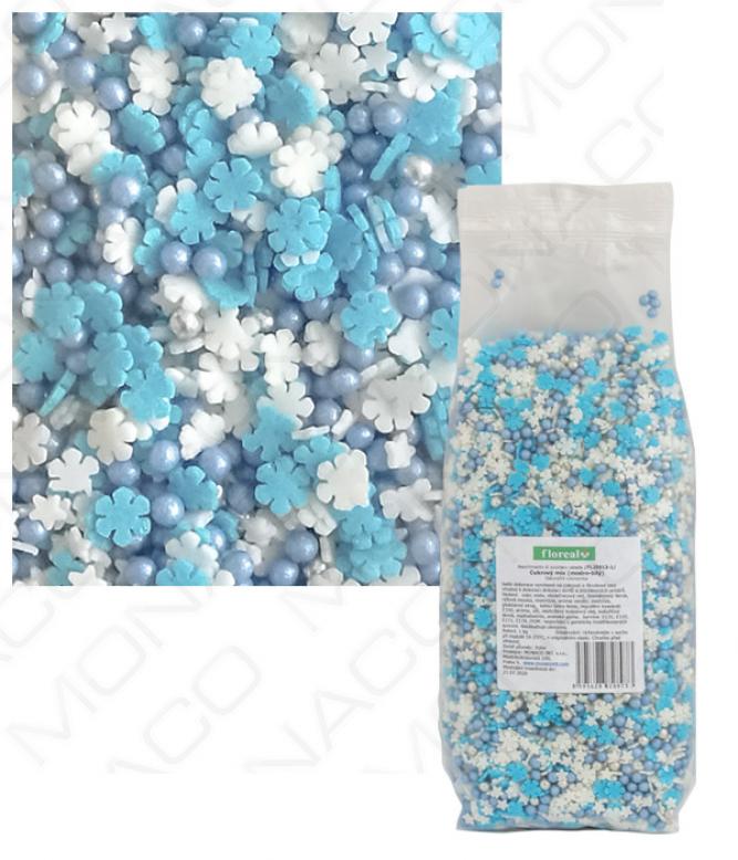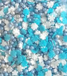 Cukrový mix vloček, kuliček a hvězdiček v barvách modré a bílé. Používá se na dekoraci dortů a zmrzlinových pohárů.