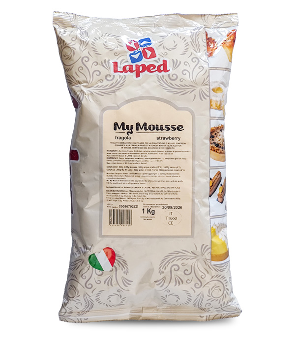 DÁVKOVÁNÍ: 200g směsi MY MOUSSE - 300g vody nebo mléka (+18°C) - 1000g šlehačky (+4°C). Smíchejte
